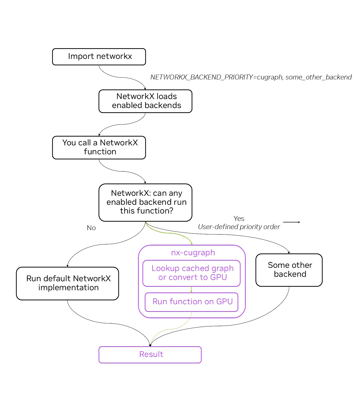 While NetworkX is a pure-Python implementation, backends may be written to use other libraries and even specialized hardware. As such, nx-cugraph is a NetworkX backend that uses RAPIDS cuGraph and NVIDIA GPUs to significantly improve NetworkX performance.